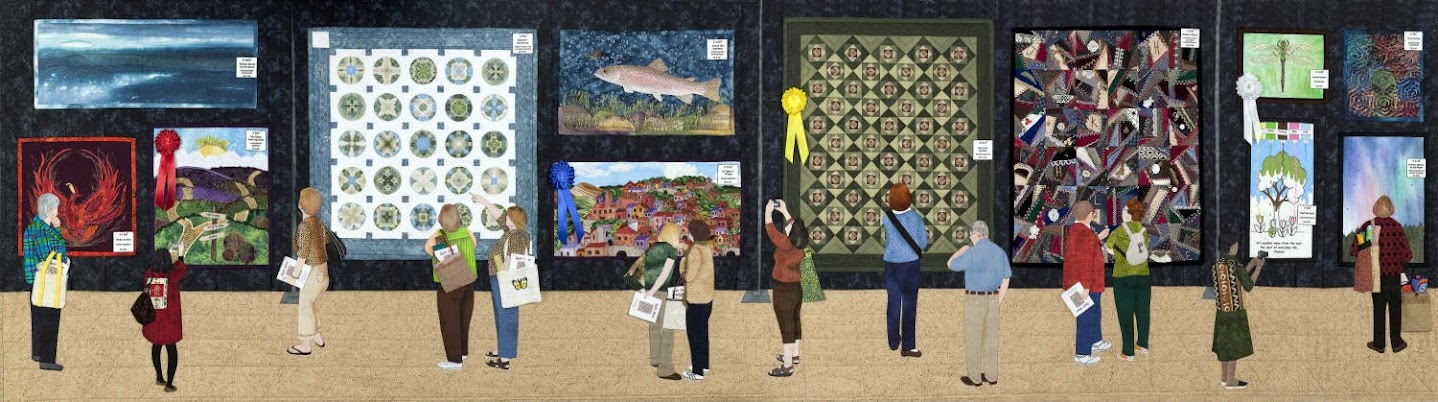 На сайте Laura Peterson можно рассмотреть подробно все фрагменты этого шедевра и даже почитать о каждом в отдельности, ведь каждый квилт, изображенный в этой работе имеет какую-то историю или кому-то посвящен, а многие друзья Лауры узнают себя среди фигурок людей! Поразительная работа! Вот так, ищешь что-то одно уникальное, а находишь другое.